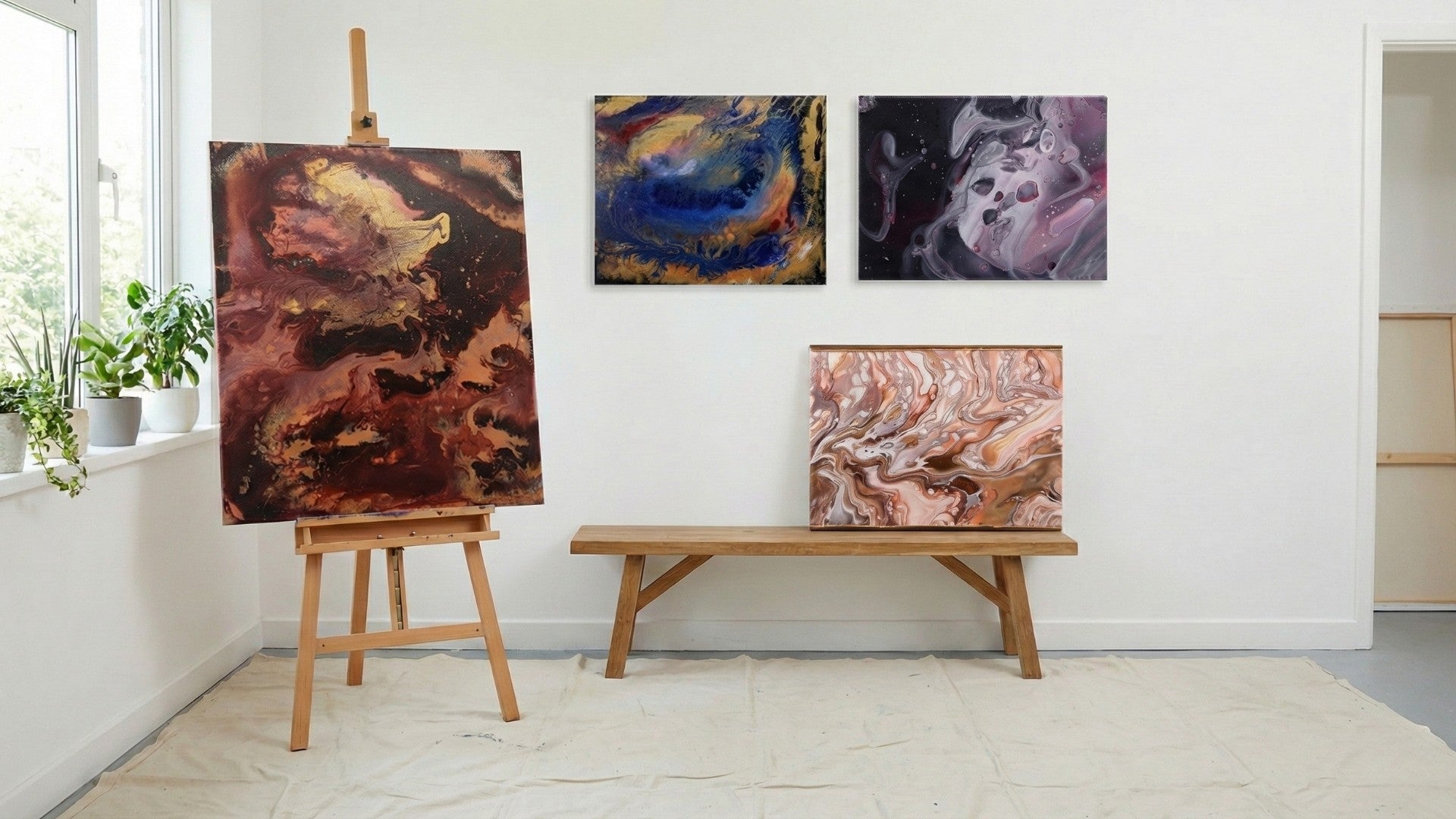 Arbeitsbereichen. Ein großformatiges Pouring Werk wird im Wohnzimmer zu einem lebendigen Highlight. Kleinere, harmonische Bilder sorgen im Schlafzimmer für eine beruhigende, moderne Atmosphäre. Im Arbeitszimmer oder Büro bringen die bewegten Farbwelten der Acrylic Pouring Technik Inspiration und Kreativität in Ihren Alltag.